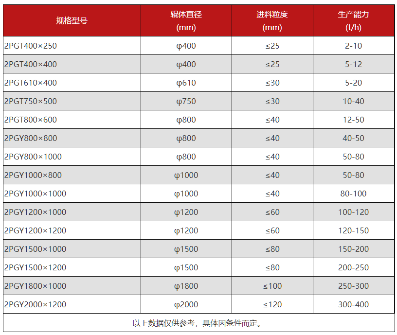 1、2PGT400×250,2PGT400×400,2PGT610×400时产2-20吨左右,属于小型弹簧对辊破碎机,适合中小型砂厂投资使用。